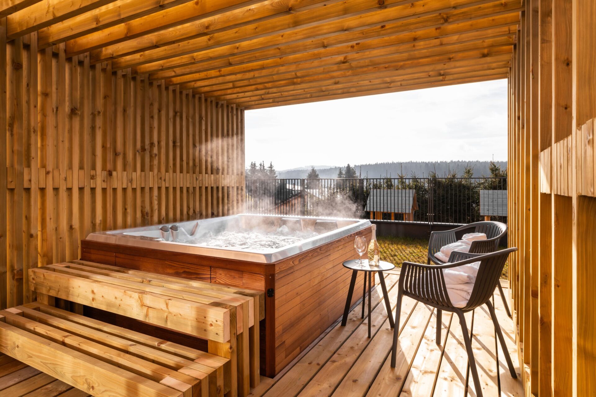 Vybavení resortu: Finská sauna, venkovní vířivka, ochlazovací a relaxační místnost, podzemní parkování.
